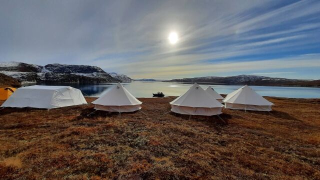 Camp Qinngua is a family-run camp located near Qasigiannguit, accessible after a 16-kilometer hike. The camp comprises one large assembly tent and six sleeping tents offering a breathtaking view of the water. The tents are equipped with bunk beds, sleeping bags, and linen. The camp also offers a peaceful environment with stunning sunsets and tranquil surroundings, making it an unforgettable experience. The assembly tent serves meals and beverages.